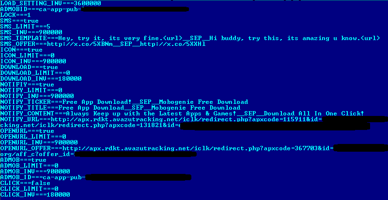 Selfmite.b is still an SMS worm with similar functionality but different approach. Its code is injected to a trojanised version of the legitimate Google Plus app which appears after the malware installation. This is different from the original version of Selfmite. Second, Selfmite.b uses configuration file which is downloaded by the worm from hxxp://209.190.28.50/setting.php which contains SMS spam message, the URL and other data used by the worm: